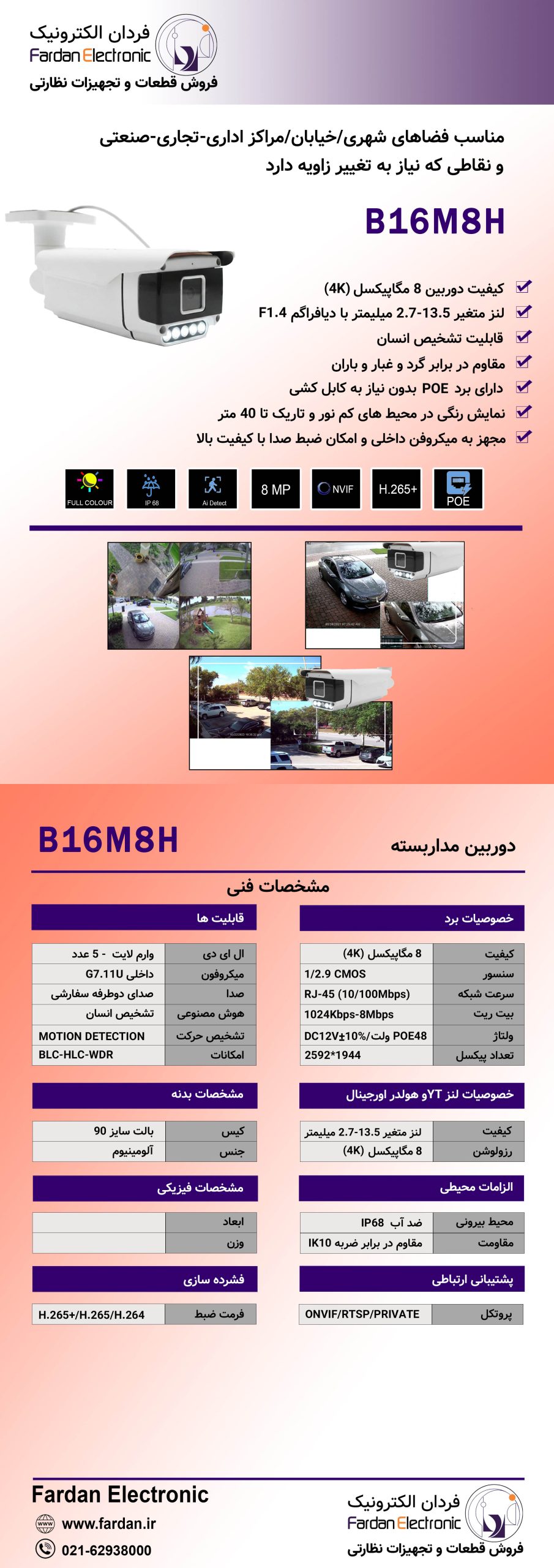 دوربین B16M8H با وضوح تصویر بسیار بالا، قابلیتهای پیشرفته و طراحی مقاوم، انتخابی عالی برای افزایش امنیت خانهها، دفاتر، فروشگاهها و محیطهای صنعتی است. امکاناتی مانند POE، دید در شب پیشرفته و میکروفن داخلی، این دوربین را به یکی از بهترین گزینههای موجود در بازار تبدیل کرده است.